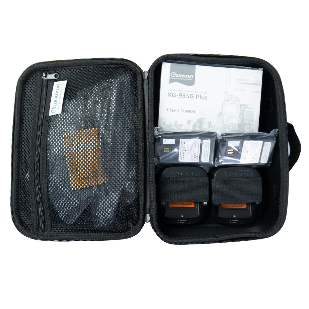 Wouxun KG-935G Plus Value Pack Includes: - Two (2) Wouxun KG-935G Plus GMRS Two Way Radios - This is one of our most popular portable handheld GMRS radios. It transmits on the 15 high powered GMRS simplex channels, 8 low powered simplex channels and all 8 GMRS repeater channels at up to 5.5 watts of power, with no special programming needed! It has dual receive capability on both UHF and VHF bands, a built-in NOAA weather Mode with weather alert, 5 weather alert notifications, and an FM radio mode. It also has 999 programmable memory channels with 155 CTCSS tones and DCS codes, transmit overtime alarm, low voltage prompt, channel name edit and display, and VOX (Voice Operated Transmit). The KG-935G Plus also features Channel Wizard for quick and easy programming in the field, a color LCD display with 10 color themes, and backlit keys.