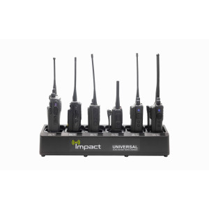 The Impact IMPC-6AC/DC Universal Desktop Charger is a 6 bank rapid rate desk top unit for charging six different batteries with or without radios attached. The IMPC-6AC/DC has a self switching (110/240V) power supply and utilizes an interchangeable cup system to allow charging with a wide range of portable radios.